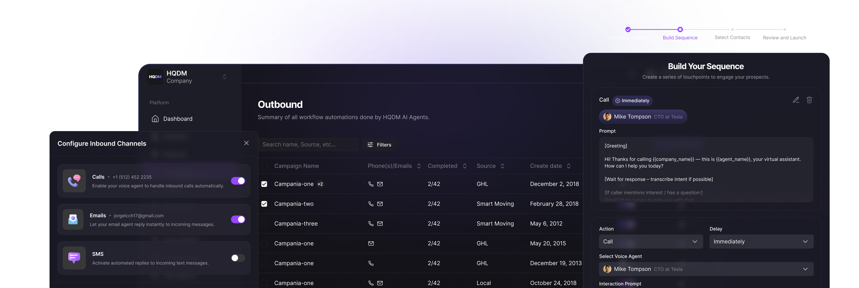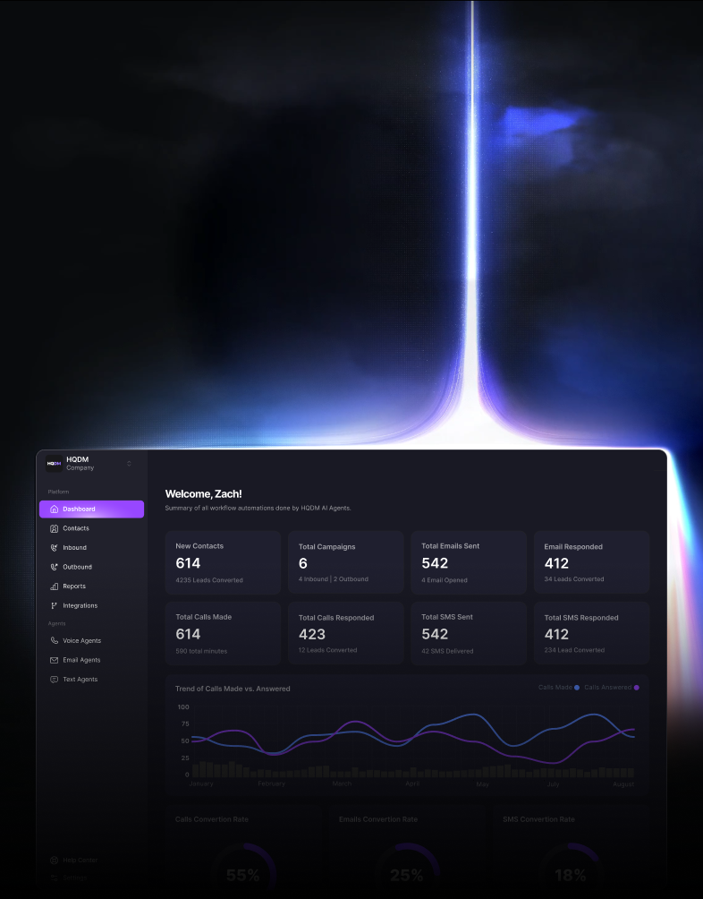 Launch smart campaigns across voice, SMS, and email — but with a closer on the other end. HQDM.ai handles inbound and outbound messages, calls, and follow-ups like your best rep… but better, and 24/7.